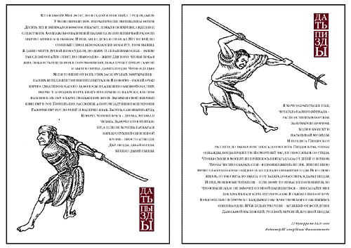 Меня тошнит от всех этих заскорузлых замухрышек - наших интеллигентов и интеллектуалов. Я говорю - разбей очки яврею, схвати волосатого за волосы и садани его башкой об стену, вырви у бородача из рук книгу и разгрызи ее на куски, а потом выплюнь их ему в харю. Покажи ему жопу. Запихни свой жирный кляп ему в рот. Потешь его, рассмеши, а потом задуши и распотроши. Разорви ему рот до ушей и выдерни язык. Засунь, сам знаешь куда. Короче, чиркни врага - дурака, мудака и чудака. Замочи его в унитазе. Ну, а если не хочешь пачкаться в их протухшей синюшной крови - просто атпизди. Дай пизды, давай пизды, крепко давай пызды.