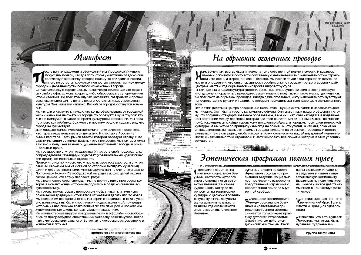 После долгих раздумий и обсуждений мы, Профсоюз Уличного Искусства, поняли, что для того чтобы уничтожить блядско-символическую экономику, которая почему-то победила в России, ничего не остается кроме как полностью стереть границу между городом и деревней путем полного исчезновения города.