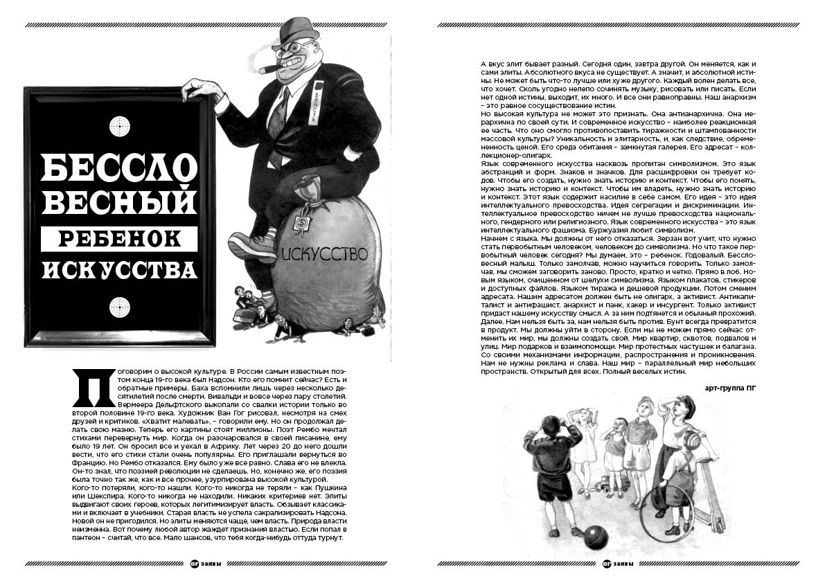 Начнем с языка. Мы должны от него отказаться. Зерзан вот учит, что нужно стать первобытным человеком, человеком до символизма. Но что такое первобытный человек сегодня? Мы думаем, это – ребенок. Годовалый. Бессловесный малыш. Только замолчав, можно научиться говорить. Только замолчав, мы сможем заговорить заново. Просто, кратко и четко. Прямо в лоб. Новым языком, очищенном от шелухи символизма. Языком плакатов, стикеров и доступных файлов. Языком тиража и дешевой продукции. Потом сменим адресата. Нашим адресатом должен быть не олигарх, а активист. Антикапиталист и антифашист, анархист и панк, хакер и инсургент. Только активист придаст нашему искусству смысл. А за ним подтянется и обычный прохожий. Далее. Нам нельзя быть за, нам нельзя быть против. Бунт всегда превратится в продукт. Мы должны уйти в сторону. Если мы не можем прямо сейчас отменить их мир, мы должны создать свой. Мир квартир, сквотов, подвалов и улиц. Мир подарков и взаимопомощи. Мир протестных частушек и балагана. Со своими механизмами информации, распространения и проникновения. Нам не нужны реклама и слава. Наш мир – параллельный мир небольших пространств. Открытый для всех. Полный веселых истин.
