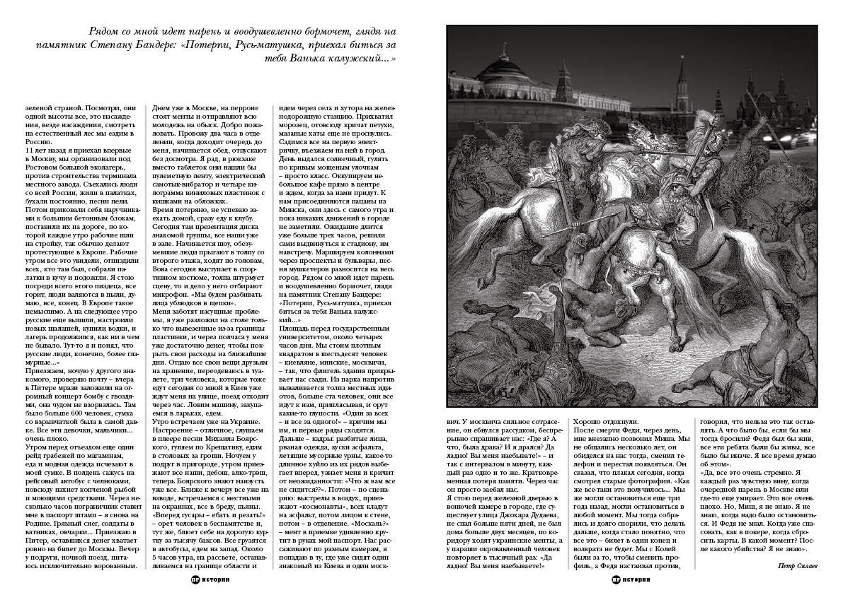 «С праздником, пидарас!» – кричит Коля и всей своей стокилограммовой массой наступает на лицо человеку в маске, лежащему на асфальте. Его товарищи, человек двадцать, бессмысленно мечутся и режут воздух ножами метрах в двадцати. Они хотели убить пару человек во время нашего концерта в лесу, но что-то пошло не так, и из рощи на них внезапно выбежала толпа с кусками деревьев, коряг, металлическим мусором. Они теперь сами оказались в роли жертв.
