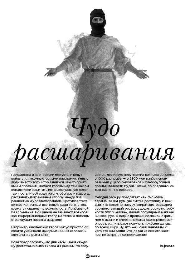 Сегодня озон.ру предлагает нам dvd «Viva, zapata!» за 164 руб. (не считая доставки). И каждый, кто подобно Иисусу, «пиратски» расшарил соответствующий ресурс, удовлетворив потребности 5000 человек, лишил популярный магазин 820000 руб. А ведь с продажи болванок с фильмом о жизни и смерти мексиканского революционера рассчитывают получать прибыли дельцы по всему миру. Ну, что же – сами виноваты. С чего это они взяли, что, делая из общего частное, не встретят сопротивление.