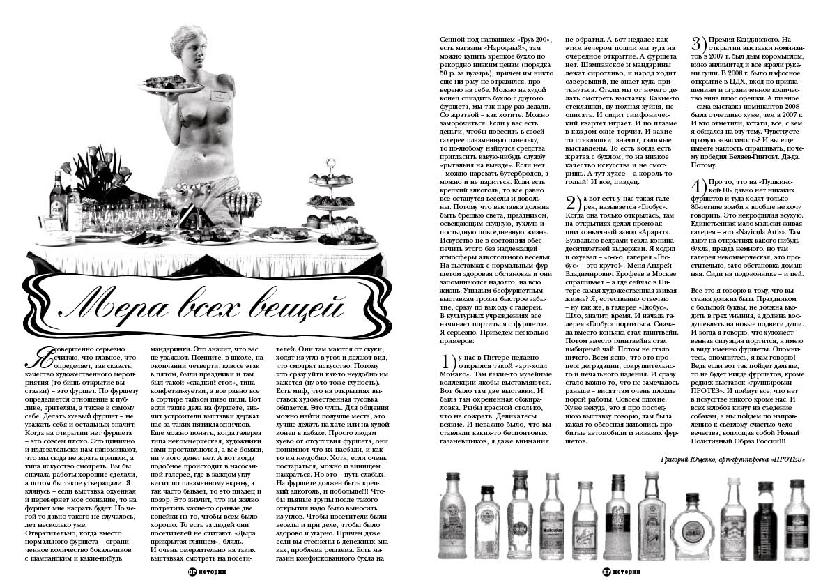Я совершенно серьезно считаю, что главное, что определяет, так сказать, качество художественного мероприятия (то бишь открытие выставки) – это фуршет. По фуршету определяется отношение к публике, зрителям, а также к самому себе. Делать хуевый фуршет – не уважать себя и остальных значит.