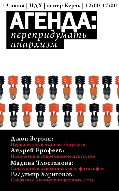 Анархизм – отличная идея – мир свободных людей, где в качестве основы социального взаимодействия лежат кооперация и солидарность. Никаких войн, никаких мусоров, никаких боссов – независимые гипердемократичные коммуны крестьян, художников и изобретателей. Одно удручает – всё, что выглядело таким реально возможным в девятнадцатом - начале двадцатого века, сегодня обратилось в милый, но неубедительный наивняк. Не то что бы люди перестали помогать друг другу, бороться против власти, хотеть свободы и равноправия – наоборот, если оглянуться, мы увидим множество горизонтальных сетей и очагов сопротивления. Но в аспекте современной техногенной, урбанистической цивилизации, где общество пронизывает необъятное количество социальных конструктов и систем отношений, ставших такими очевидными под пристальным взглядом критических теорий, визионерские анархо-проекты более не выглядят убедительными. И тем не менее нет смысла отказываться от утопического – любой проект – это по сути утопия, а его воплощение зависит от увлечённости и адекватности «проектёров». Хотя, возможно, «проект» – не лучшая формулировка, ведь анархизм это не модель, и даже не теоретическая система. Анархизм – это скорее ряд этических императивов, а также процесс движения по этим базисным принципам к обществу, где они будут играть главную роль. Но чтобы двигаться эффективней – надо рассмотреть окружающую действительность. Именно желание обозреть окружающий нас мир в надежде найти основу для нового анархического проектирования является причиной нашего мероприятия. В рамках него мы решили сосредоточиться на ряде неочевидных теоретических площадок, по нашему мнению пригодных для обновления антиавторитарного проекта.